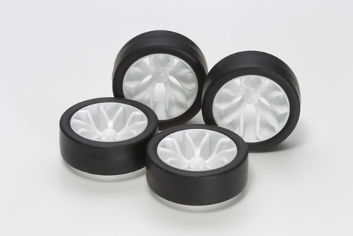 The wheels in this set are a color variation of those in the Raikiri Mini 4WD kit (Item 18640). They are paired with stylish low-profile tires.