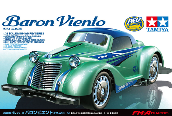 Custom / classic car body wraps eyes! It is a plastic model assembly kit of high performance racer adopting shaft drive four wheel drive. Baron Vient is a charm of a classic car form such as a long hood and a standing front grille, and before and after fenders showing an elegant line. Moreover, you can not overlook the custom made finish with the modification called "chopped roof" which lowered the height of the roof (roof) and lowered the car height. Body is light green ABS resin. In the real car, the top of the fabric made of cloth expresses texture by changing body and surface treatment. The front grill of another part prepares a metal style sticker and the three-dimensional feeling is also sufficient. Adopt FM - A chassis of front motor layout Chassis adopted FM - A of front motor layout incorporating aero design. Since the center of gravity is more than the front of the car body, it is possible to run with a sense of stability even on a course with many ups and downs. Starting with standard low skid bar made of low friction resin on the front lower part, 4 rollers made of low friction resin. Especially the rear roller has made it 8 mm thick type which increased stability. In addition, the motor can be easily replaced from the bottom of the chassis, and the setting change is also fast. Various parts are attached to the aero side stay made with the hint of the sectional shape of the wing of the airplane. In addition, the white color wheel is a retro dish design that looks good on classic cars. I also set a sticker for a metallic tone wheel. 3.5: 1 with super fast gear. Basic Specification