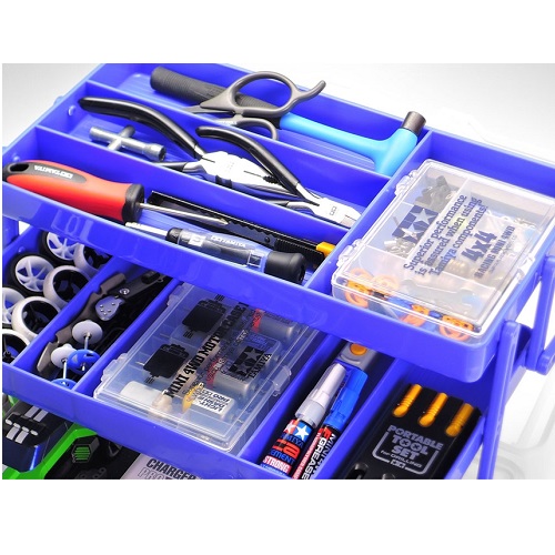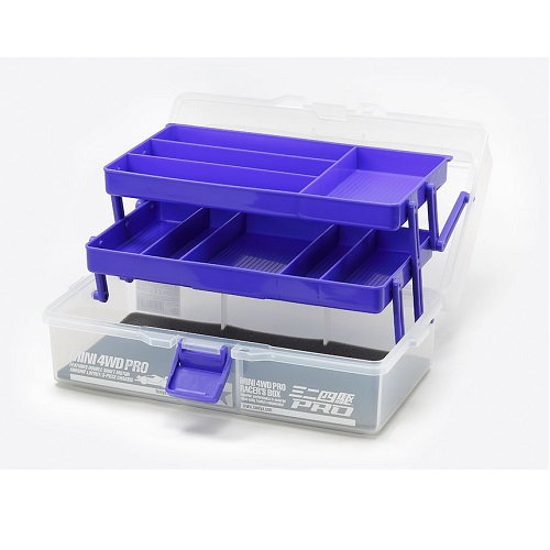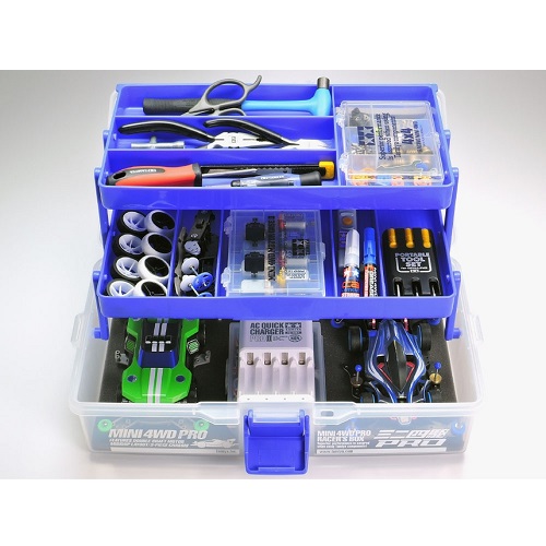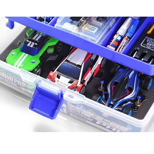 | This box was designed especially for the Mini 4WD racer! The various internal sections expand once the box is opened, allowing quick access to your parts. Dividers can be moved depending upon the size of the parts you carry. The bottom section can hold up to three fully hopped-up Mini 4WD cars. Dimensions: 310mm x 214mm x 132mm |
