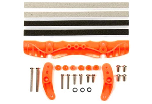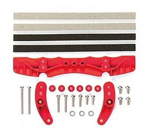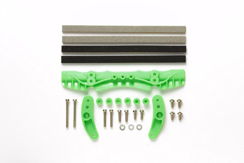 |  This Brake Set, designed for the AR Chassis, includes a brake plate, adapters, two kinds of brake sponges, and 3 types of spacers. By using the adapters and spacers, brake parts attachment positions can be easily changed, allowing fine setting adjustment according to the race track. The brake plate features a skid angle to prevent speed loss on the grass track sections of some tracks.