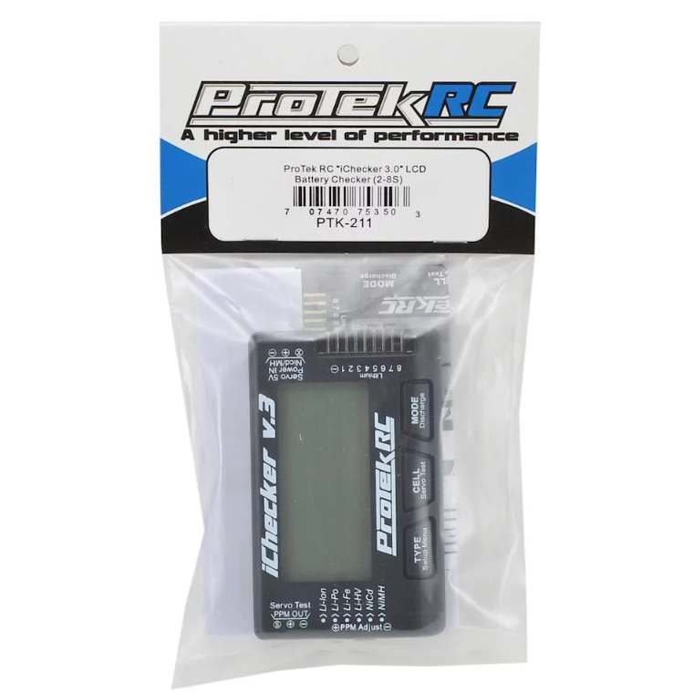 |  This is the ProTek R/C "iChecker 3.0" LCD Battery Checker. The "iChecker 3.0" provides you with an affordable way to monitor the condition of your batteries and allows you to easily see the total voltage, capacity, individual cell voltage, lowest & highest cell voltage, as well as the voltage difference between cells on 2S to 8S Lithium batteries with a simple tap of the buttons.