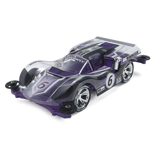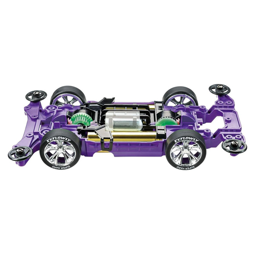 The Tamiya 1/32 JR PRO Racing Exflowly Purple Special Mini 4WD Kit is a special edition release of the classic Exflowly (original kit: TAM18612). This updated version features a speed-oriented clear polycarbonate body paired with the easy to assemble MS chassis in a purple-themed color scheme.