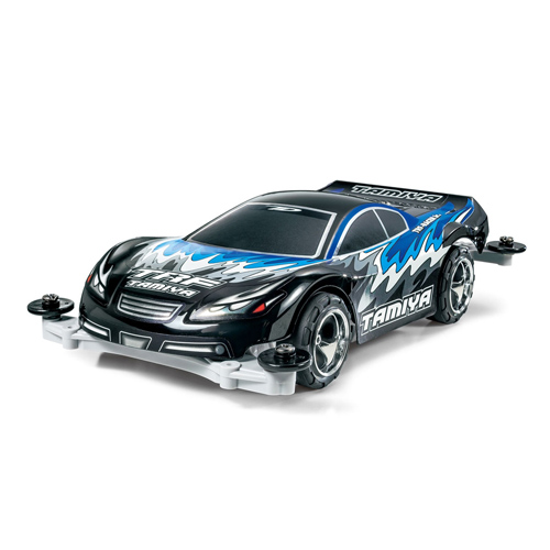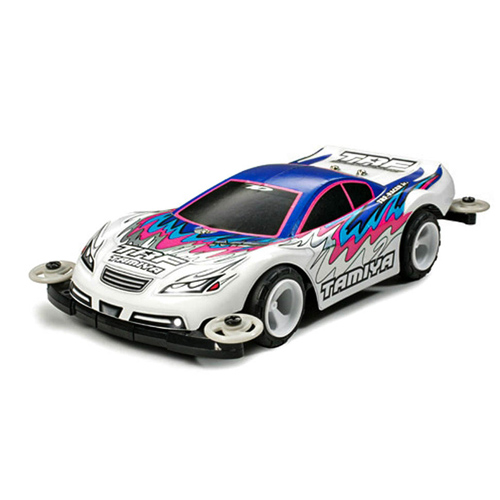 This high-performance Mini 4WD racer features a 3-piece chassis with nose, center, and tail sections for easy assembly. Double shaft motor drives all 4 wheels and is located at the center of the chassis with 1 battery on each side, giving the chassis excellent balance. The race car body is made from lightweight polycarbonate and is styled like a car belonging to Tamiya's world-famous Team TRF. Small diameter white wheels with slick tires and 3.5:1 gear ratio ensure quick running performance on the track. In addition, there is a large variety of Grade-Up Parts to choose from to customize your machine.