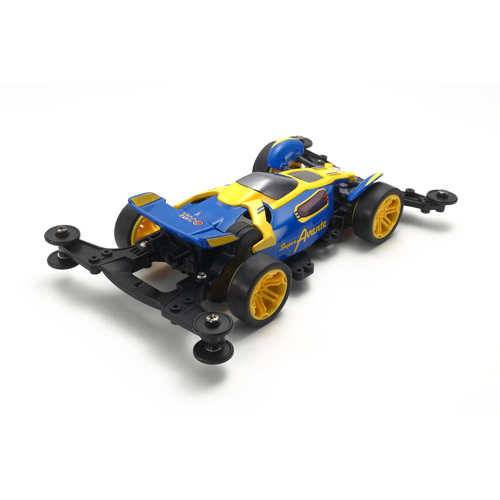 This Mini 4WD race kit depicts the Super Avante Jr. which is paired with the VZ chassis and has a body designed by Japanese designer Kota Nezu of znug design, who designed our recently-released R/C Super Avante body (Item 58696). This Mini 4WD model renders the Super Avante’s streamlined design in smaller scale with distinctive, small-type front fenders!