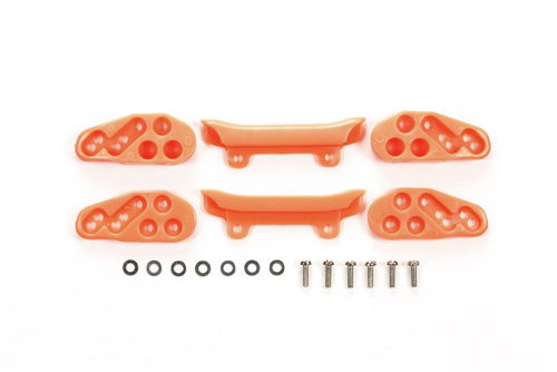 This is a orange version of the Mini 4WD front under guard, which serves as a brake and helps your car stay on track after jump landings. Its three-piece configuration enables both normal and wide roller settings. Two sets of under guards with different thicknesses are included for use with large and small diameter wheels.