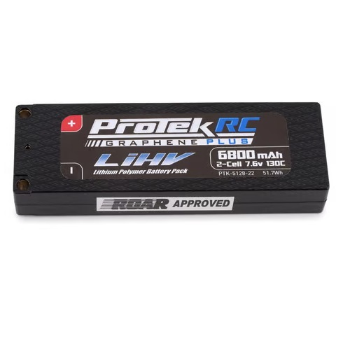 | The ProTek R/C 2S 130C Graphene + HV 6800mAh LiPo Battery is the perfect battery option for anyone looking for a lightweight and high capacity LiPo battery. Weighing only 287 grams, this 2S pack is lighter than a standard 2S pack, with much higher capacity. These advancements lead to increase in both voltage and punch throughout a run.