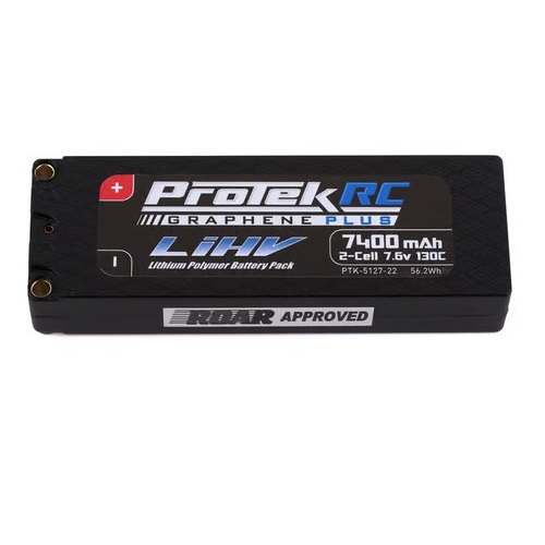 | The ProTek R/C 2S 130C Graphene + HV 7400mAh LiPo Battery is the perfect battery option for anyone looking for a lightweight and high capacity LiPo battery. Weighing only 324 grams, this 2S pack is lighter than a standard 2S pack, with much higher capacity. These advancements lead to increase in both voltage and punch throughout a run.