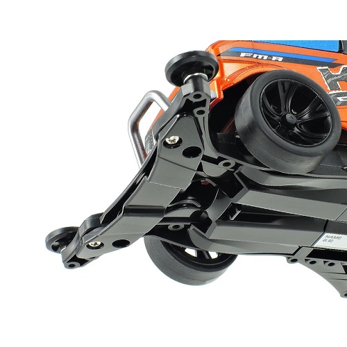 | Here comes a brand new Mini 4WD model capturing one of the customized small trucks which have recently become popular in Japan. This model gives a playful image, and is sure to catch everyone’s attention at the track with its unique form.   Aerodynamic Front Motor Chassis The FM-A chassis is a front motor unit with advanced aerodynamic themes that - thanks to its center of gravity toward the front - is at home on a whole variety of track types including those with frequent elevation changes. It comes equipped with low-friction front skid bar and roller (4 included) parts, while rear rollers are 8mm thick for superb stability. The chassis underside allows easy access to the motor and quick setup changes. Includes 3.5:1 gears and a motor.   - Mini 4WD model assembly kit. Length: 144mm, width: 97mm, height: 61mm. - Body is molded in Metallic Orange, and consists of two separate sections to offer the easier two-tone color painting job. - Comes with separate parts for animal guard and roll bar. - Features front motor layout with aerodynamic design low-friction skid bar on front bumper underside. - Black polypropylene A-spoke wheels are paired with super hard small-diameter low-profile tires (black). - 8mm thickness side rollers give stability and a lightweight model. - Dedicated metallic stickers are packaged in the kit. - Type 130 motor is included. The model features a 5:1 gear ratio. - Two AA batteries are required (sold separately). - A wide range of Grade-Up Parts is available separately to customize your car. |