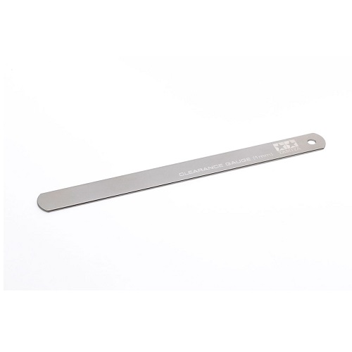 - Carbon steel tool with plating applied. Features the Tamiya logo and the lettering "CLEARANCE GAUGE 1mm" laser inscribed.