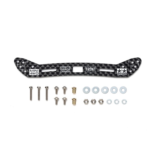 Attach this rigid 2mm thick carbon fiber wide front plate (sliding dampers) directly to your Mini 4WD chassis as a roller stay or use it in place of the aluminum roller stay in Item 15469 Wide Front Sliding Damper. Choose an attachment method suited to your preferred setup.