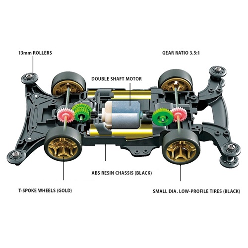 - Includes a type 130 double-shaft motor. The model features a 3.5:1 gear ratio.