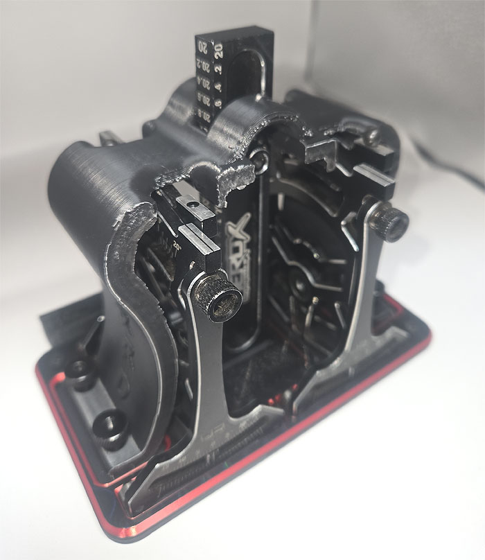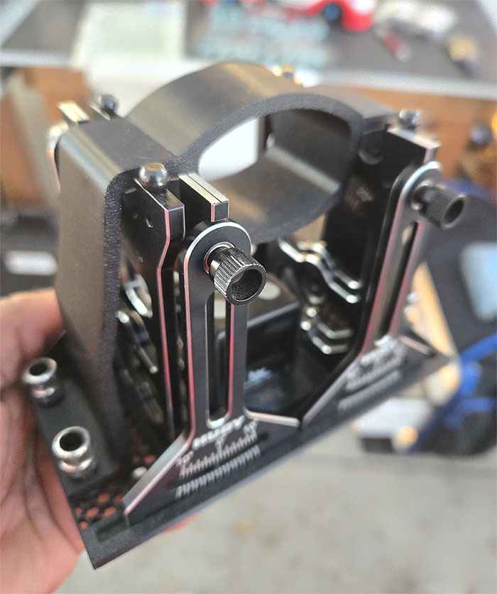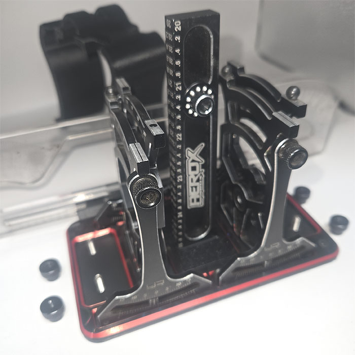 You can store Aerox droop guage in center and or the KM Motosports digital inclinimeter (with slot to slide steel mounting bracket)