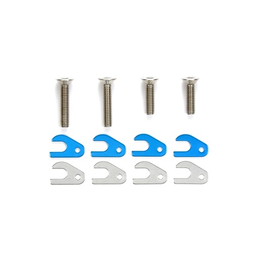 These spacers enable fine ground clearance and skid angle adjustments of the RM-01 chassis' front suspension, enabling a wider range of setting adjustments as well as increased suspension attachment rigidity.