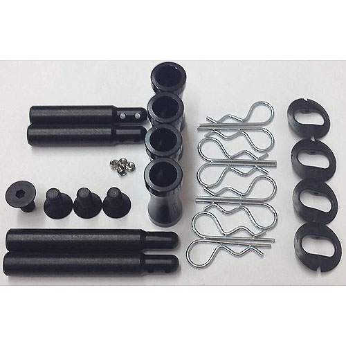 These body mounts feature (4) beautifully machined shiny black anodized aircraft alloy Aluminum body mount bases, and (4) machined Delrin body posts. Finishing off the body posts are (4) Nylon body mount swivels that allow these mounts to work with any body style, (4) black anodized Aluminum 8-32 flat head socket screws, (4) Stainless Steel set screws and (8) Zinc plated body clips.